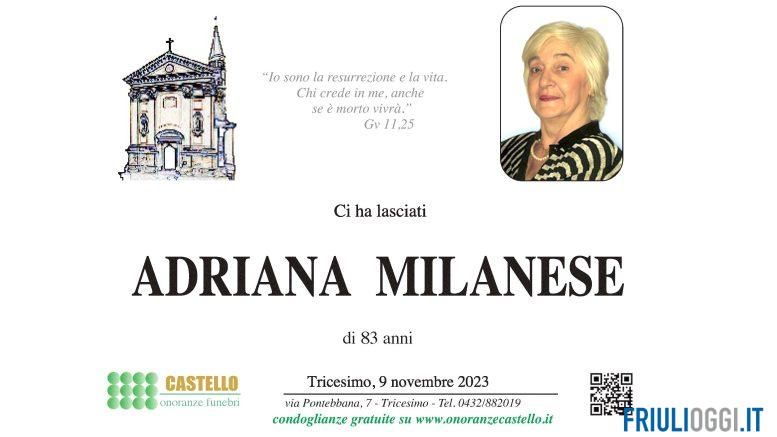Ci ha lasciati all’età di 83 anni Adriana Milanese. Ne danno l’annuncio la figlia Alessia con Paolo e Elyas, la sorella Laura, il nipote Daniele, si uniscono Antonella e Francesco.