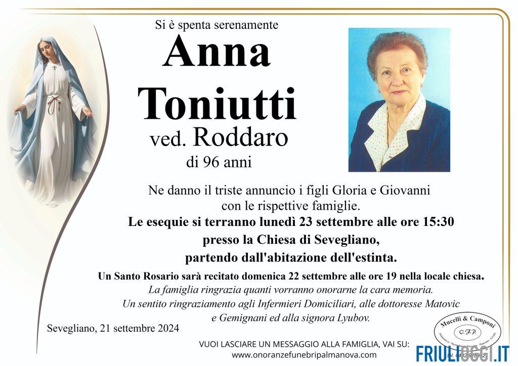 Ne danno il triste annuncio i figli Gloria e Giovanni con le rispettive famiglie. Le esequie si terranno lunedì 23 settembre alle ore 15:30 presso la Chiesa di Sevegliano, partendo dall’abitazione dell’estinta.