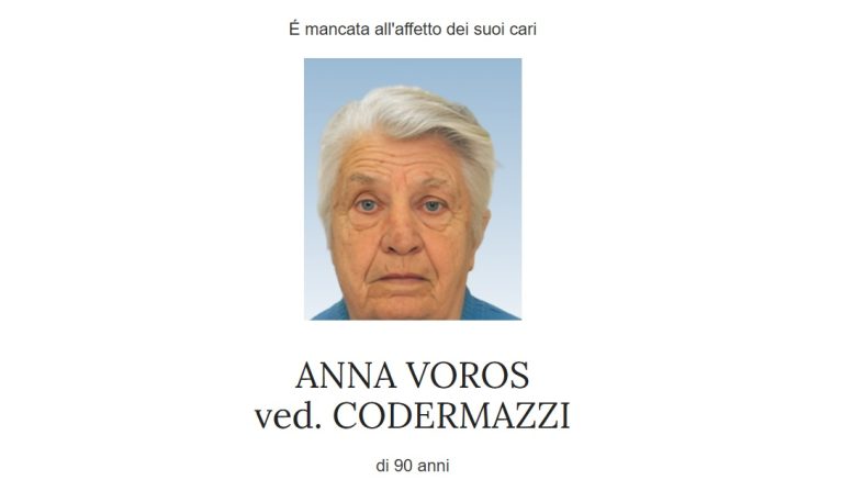É mancata all’affetto dei suoi cari Anna Voros. Ne danno il triste annuncio il figlio Alessio unitamente ai parenti tutti.