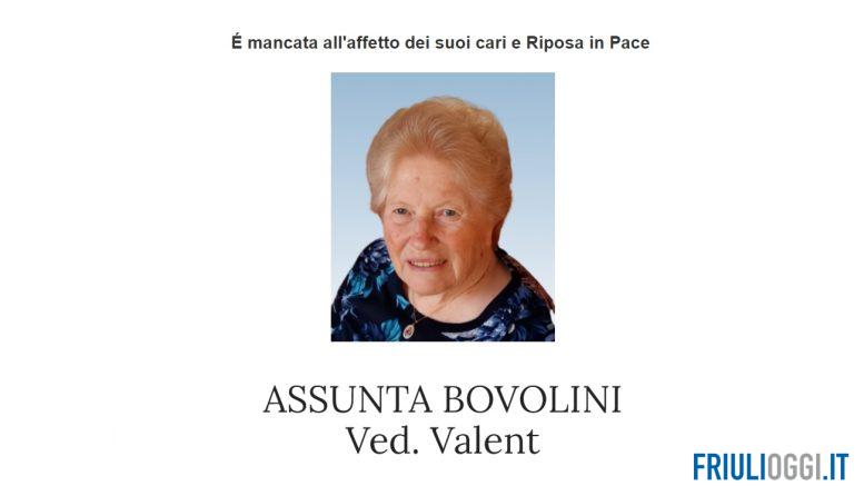 É mancata all’affetto dei suoi cari e Riposa in Pace Assunta Bovolini. Ne danno il triste annuncio le figlie Silvana, Renata e Gianna, i generi, i nipoti Mauro, Daniele, Alberto, Lorenzo, il pronipote Giacomo unitamente ai parenti tutti.