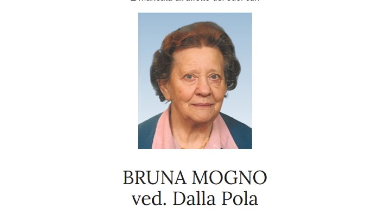 É mancata all’affetto dei suoi cari Bruna Mogno. Ne danno il triste annuncio il figlio Claudio assieme alla nuora Savina, le adorate nipoti Martina con Stefano e Francesca con Alessandro, i pronipoti Edoardo e Diana.
