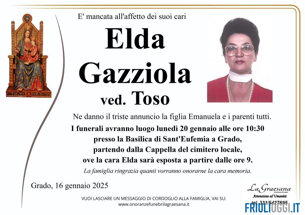 Ne danno il triste annuncio la figlia Emanuela e i parenti tutti. I funerali avranno luogo lunedì 20 gennaio alle ore 10:30 presso la Basilica di Sant’Eufemia a Grado, partendo dalla Cappella del cimitero locale, ove la cara Elda sarà esposta a partire dalle ore 9:00.