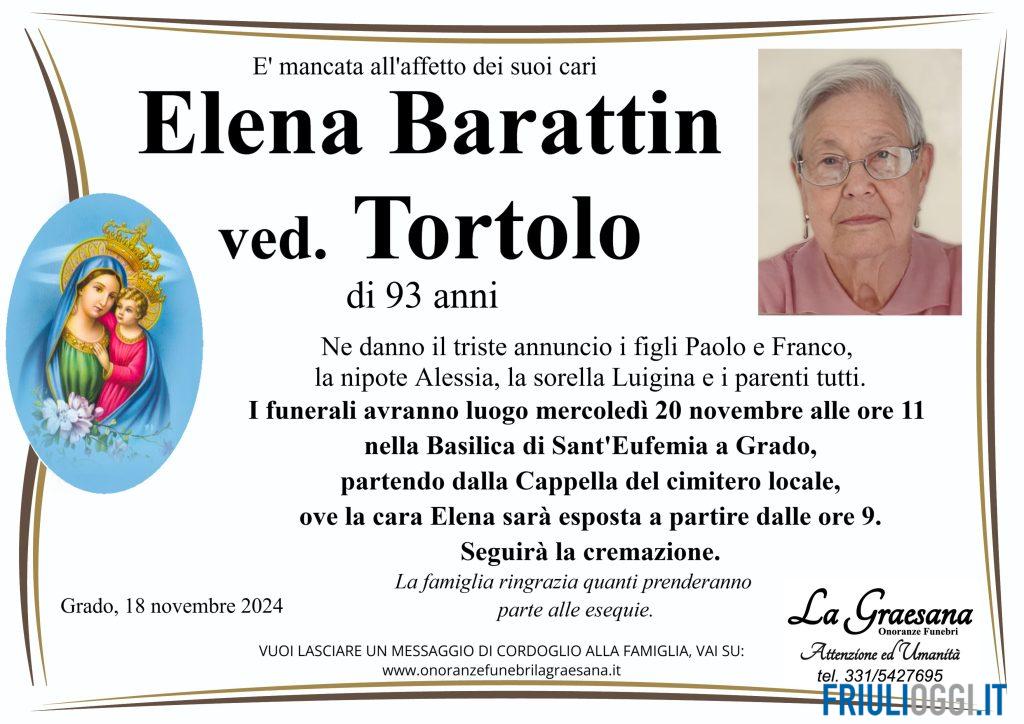 Ne danno il triste annuncio i figli Paolo e Franco, le nipoti Alessia, la sorella Luigina e i parenti tutti. I funerali avranno luogo mercoledì 20 novembre alle ore 11:00 nella Basilica di Sant’Eufemia a Grado, partendo dalla Cappella del cimitero locale, ove la cara Elena sarà esposta a partire dalle ore 9. Seguirà la cremazione.