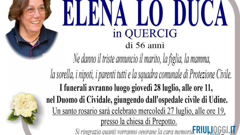 E’ mancata all’affetto dei suoi cari Elena Lo Duca (in Quercig). Ne danno il triste annuncio il marito, la figlia, la mamma, la sorella, i nipoti, i parenti tutti e la squadra comunale di Protezione Civile.