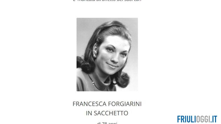 E’ mancata all’affetto dei suoi cari all’età di 78 anni Francesca Forgiarini. Ne danno il triste annuncio il marito Renato unitamente ai parenti tutti.