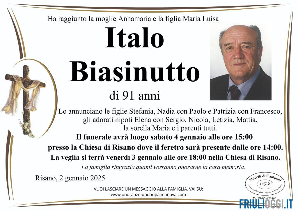 Ne danno il triste annuncio le figlie Stefania, Nadia con Paolo e Patrizia con Francesco, gli adorati nipoti Elena con Sergio, Nicola, Letizia, Mattia, la sorella Maria e i parenti tutti. I funerali avranno luogo sabato 4 gennaio alle ore 15:00 presso la Chiesa di Risano dove il feretro sarà presente dalle ore 14:00. La veglia si terrà venerdì 3 gennaio alle ore 18:00 nella Chiesa di Risano.