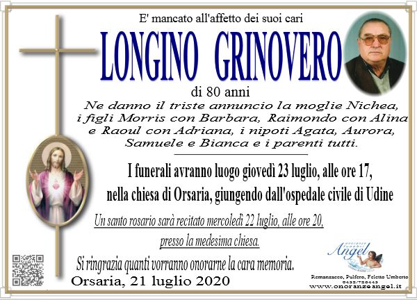 E’ mancato all’affetto dei suoi cari all’età di 80 anno Longino Grinovero. Ne danno il triste annuncio la moglie Nichea, i figli Morris con Barbara, Raimondo con Alina e Raoul con Adriana, i nipoti Agata, Aurora, Samuele e Bianca e i parenti tutti.
