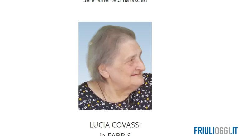 Serenamente ci ha lasciati all’età di 84 anni Lucia Covassi (in Fabris). Ne danno il triste annuncio il marito Ferruccio, i figli Anna Chiara con Roberto e Andrea con Carmen, i nipoti Veronica con Emanuele, Giacomo e Adele unitamente ai parenti tutti.