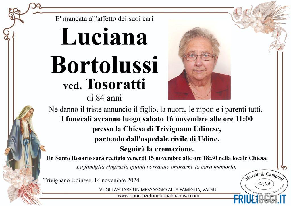 Ne danno il triste annuncio il figlio, la nuora, le nipoti e i parenti tutti. I funerali avranno luogo sabato 16 novembre alle ore 11:00 presso la Chiesa di Trivignano Udinese, partendo dall’ospedale civile di Udine. Seguirà la cremazione.