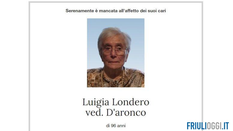 E’ mancata all’affetto dei suoi cari Luigia Londero vedova D’aronco. Ne danno il triste annuncio il figlio Giacomino, la figlia Lucia, il genero Sergio, la nipote Sabrina con Thomas, il pronipote Nicolò, Luisa, le cognate, i nipoti unitamente ai parenti tutti.