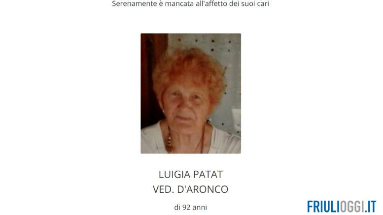 Serenamente è mancata all’affetto dei suoi cari all’età di 92 anni Luigia Patat. Ne danno il triste annuncio le figlie Vanda, Morena e Virna, i generi, la sorella, il fratello, le cognate, i nipoti, i pronipoti ed i parenti tutti.