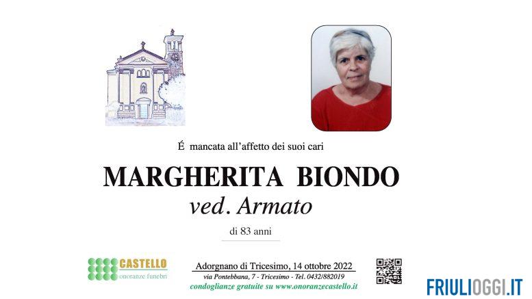 E’ mancata all’affetto dei suoi cari all’età di 83 anni Margherita Biondo. Ne danno il triste annuncio i figli, la nuora, i nipoti, la sorella, il cognato ed i parenti tutti.