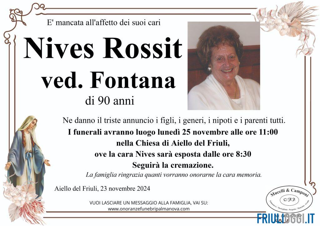 Ne danno il triste annuncio i figli, i generi, i nipoti e i parenti tutti. I funerali avranno luogo lunedì 25 novembre alle ore 11:00 nella Chiesa di Aiello del Friuli, ove la cara Nives sarà esposta dalle ore 8:30. Seguirà la cremazione.