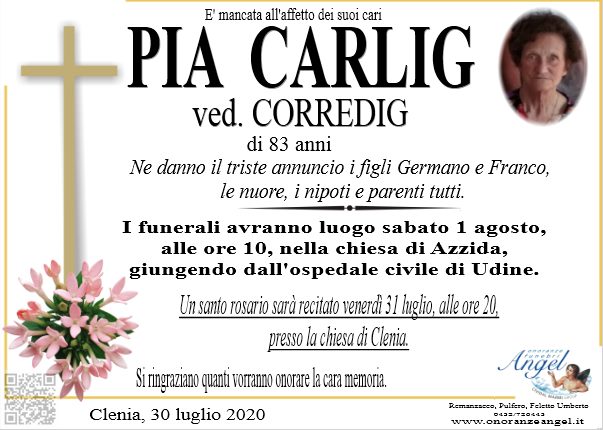 E’ mancata all’affetto dei suoi cari all’età di 83 anni Pia Carlig (Ved. Corredig). Ne danno il triste annuncio i figli Gemano e Franco, le nuore, i nipoti e i parenti tutti.