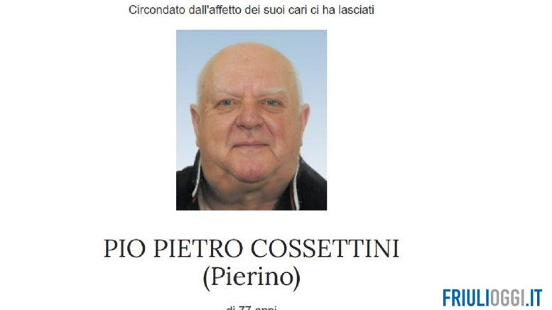 Circondato dall’affetto dei suoi cari ci ha lasciati Pio Pietro Cossettini. Ne danno il triste annuncio la moglie Maria, il figlio Fabio assieme a Nadia e l’adorata nipote Giulia, i fratelli, le sorelle, i nipoti unitamente ai parenti tutti.