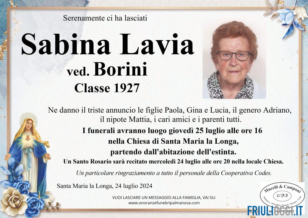 Ne danno il triste annuncio le figlie Paola, Gina e Lucia, il genero Adriano, il nipote Mattia, i cari amici e i parenti tutti. I funerali avranno luogo giovedì 25 luglio alle ore 16:00 nella Chiesa di Santa Maria la Longa, partendo dall’abitazione dell’estinta.