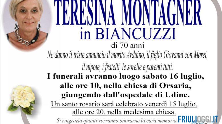 E’ mancata all’affetto dei suoi cari all’età di 70 anni Teresina Montagner. Ne danno il triste annuncio il marito Arduino, il figlio Giovanni con Marei, il nipote, i fratelli, le sorelle e parenti tutti.