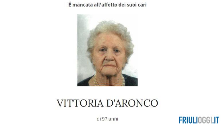 É mancata all’affetto dei suoi cari all’età di 97 anni Vittoria D’Aronco. Ne danno il triste annuncio la sorella, i nipoti, i pronipoti unitamente ai parenti tutti.