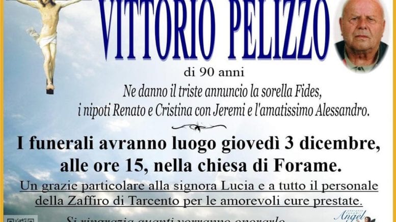 E’ mancato all’affetto dei suoi cari all’età di 90 anni Vittorio Pelizzo. Ne danno il triste annuncio la sorella Fides, i nipoti Renato e Cristina con Jeremi e l’amatissimo Alessandro.