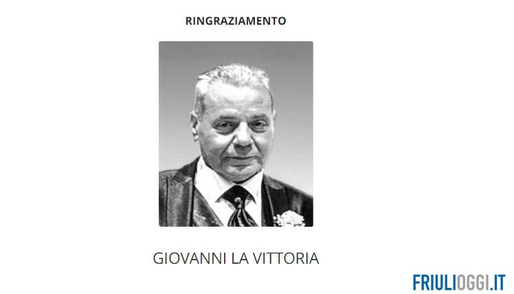 Con affetto e gratitudine, la moglie Luisa Cattarossi assieme all’adorata nuora Elisa Stefenati, vogliano ringraziare di cuore, tutti coloro che con il vostro dolce pensiero, ci avete dato conforto, in questo doloroso momento, per la perdita del nostro caro Giovanni La Vittoria.