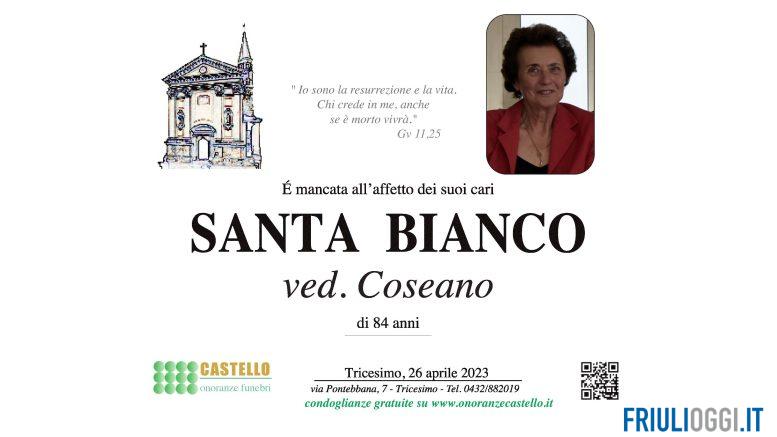 E’ mancata all’affetto dei suoi cari Santa Bianco. Ne danno l’annuncio il figlio Andrea, la nuora Emanuela, i nipoti Simone e Alessia con Matteo, la pronipote Aurora, i cognati e i parenti tutti.