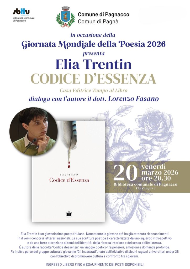 Non è frequente che un giovane scelga oggi la poesia come forma espressiva privilegiata. Proprio per questo l’appuntamento in programma a Pagnacco in occasione della Giornata Mondiale della Poesia assume un significato particolare. Venerdì 20 marzo alle 20.30 la Biblioteca comunale ospiterà infatti la presentazione del libro Codice d’Essenza del giovane autore friulano Elia Trentin.