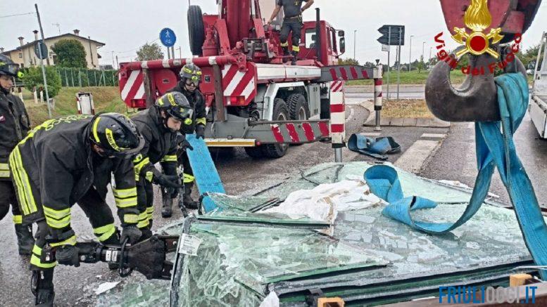 Incidente questa mattina, intorno alle 9, lungo la Strada del Mobile, a Pasiano di Pordenone. Un camion ha perso il carico di lastre di vetro che stava trasportando.