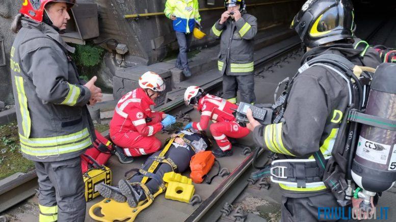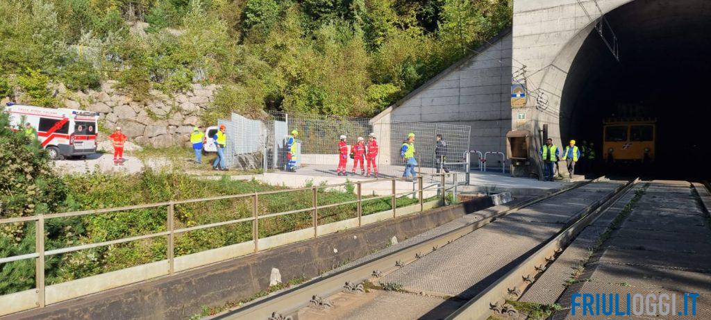 Un treno passeggeri che deraglia, si ferma per un guasto in galleria, dal motore esce del fumo, è necessario abbandonare il convoglio e uscire dal tunnel: uno scenario tragico messo in scena ieri mattina a Pontebba, nella galleria ferroviaria Zuc dal Bor, come esercitazione della Protezione Civile.