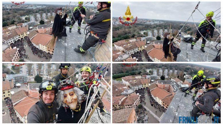 Grande spettacolo per la discesa della befana dal campanile di San Marco, a Pordenone, condotta dai vigili del fuoco del locale comando con l’impiego di tecniche SAF, ovvero di derivazione Speleo Alpino Fluviale.
