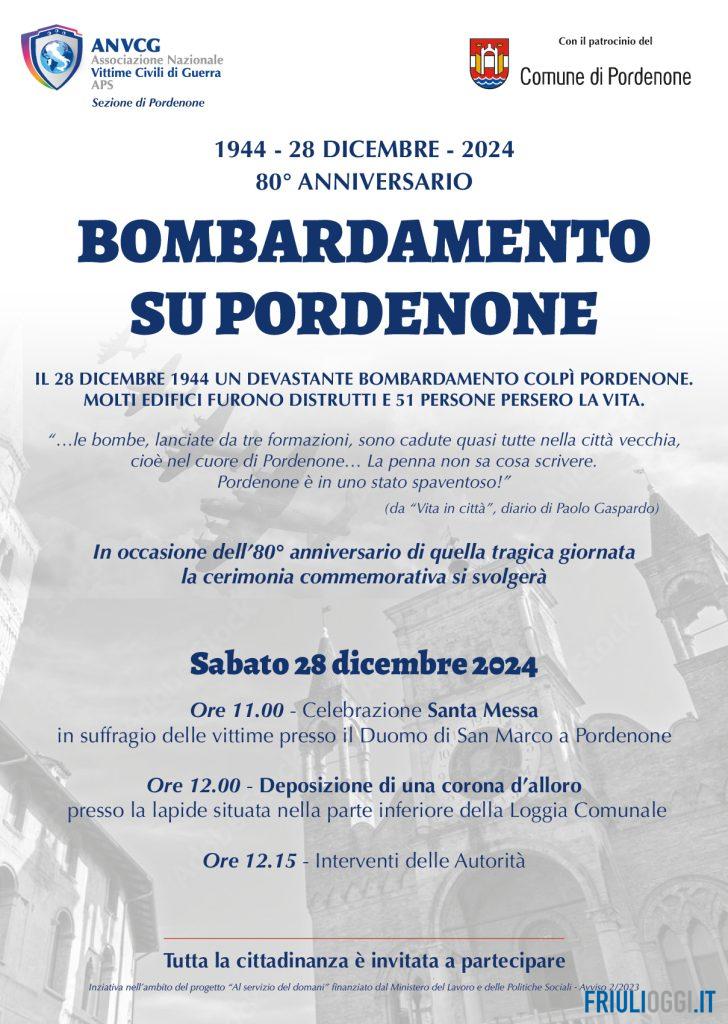 Il 28 dicembre ricorre l’80° anniversario del grande bombardamento che colpì Pordenone durante la Seconda Guerra Mondiale. Per ricordare quel terribile evento dell’inverno del 1944 nel quale morirono 51 persone, sabato 28 alle ore 11.00 sarà celebrata nel Duomo di San Marco una messa in ricordo delle vittime.