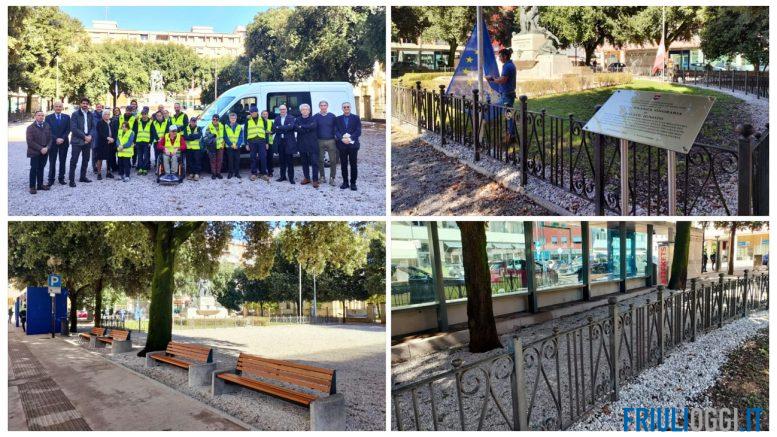 A conclusione dei lavori periodici di riqualificazione di piazzale Ellero dei Mille a Pordenone, si è svolta una breve cerimonia a cui hanno preso parte il vicesindaco reggente Alberto Parigi, l’assessore all’ambiente Mattia Tirelli, la sig.ra Julia Marchi presidente provinciale e regionale dell’Associazione famiglie caduti e dispersi in guerra, Aldo Ferretti presidente dell’Istituto del Nastro Azzurro, la cooperativa Servizi FVG, GEA, gli uffici tecnici del Comune e i tanti ragazzi e ragazze del progetto “Pordenone pulita e inclusiva”.