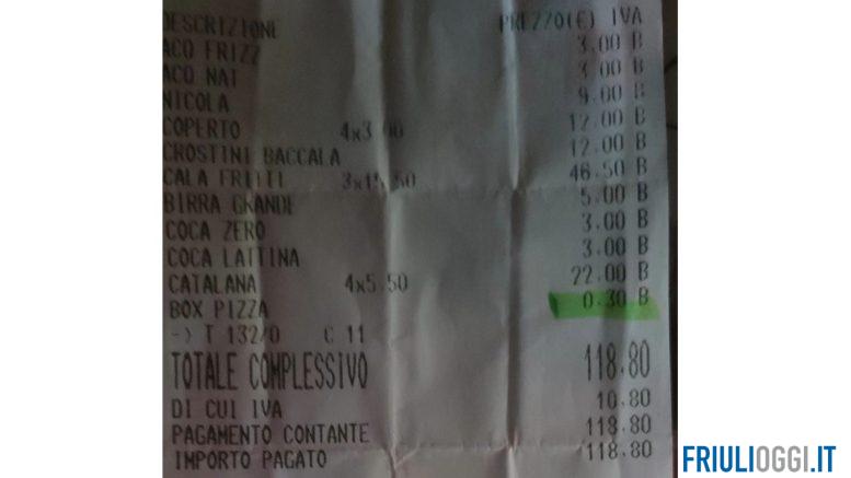 Trenta centesimi: di per sé, non sono tanti né da pagare né da abbuonare; si tratta della cifra addebitata a dei clienti di un ristorante/pizzeria nel Pordenonese per il cartone da asporto della pizza al termine di una cena da 118 euro ed è questo addebito che ha scatenato la polemica social sullo scontrino.