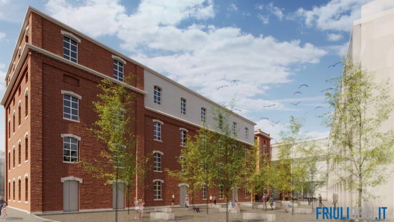 e alla didattica, ospiterebbe i corsi universitari dell’ISIA. L’edificio storico del Molino restaurato sarebbe organizzato su 4 livelli e, ad ogni piano, una grande hall completamente vetrata nei due lati liberi costituirebbe il luogo di arrivo e partenza degli studenti, uno spazio di sosta durante la giornata, un luogo di mostre temporanee. Una piazzetta alberata fungerebbe da connessione tra l’edificio storico ed uno nuovo, eretto lungo via della Ferriera, che ospiterebbe il “Centro Internazionale del Design Alto Adriatico”.