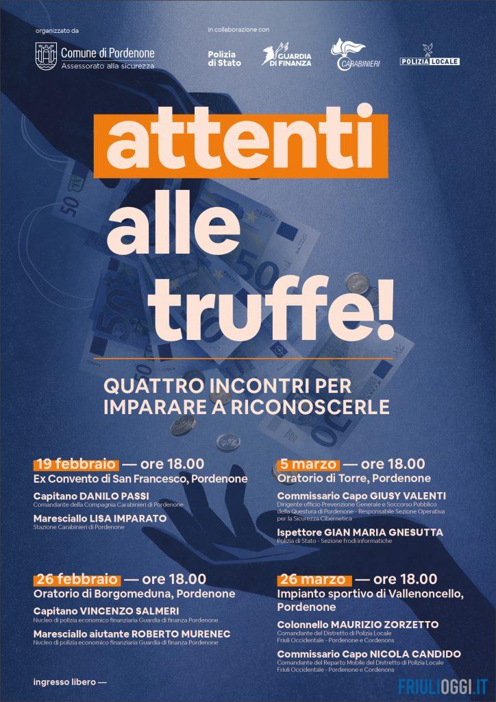 A Pordenone quattro incontri dedicati alla prevenzione delle truffe per promuovere la cultura della legalità e della sicurezza. Questi appuntamenti intendono insegnare a riconoscere le diverse tipologie di raggiri, da quelli on line a quelli porta a porta, con l’obiettivo di mettere in guardia i cittadini di ogni età, offrendo loro gli strumenti per difendersi da questi attacchi meschini.