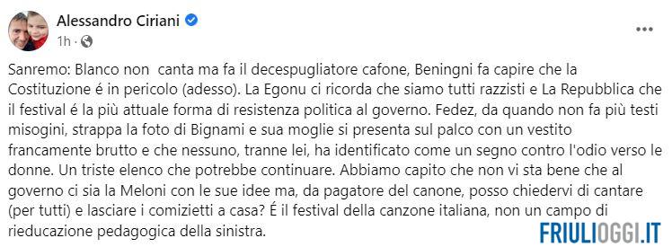 “Blanco non canta, ma fa il decespugliatore cafone, Benigni fa capire che la Costituzione é in pericolo (adesso) – ha scritto sulla sua pagina fb -. La Egonu ci ricorda che siamo tutti razzisti e La Repubblica che il festival é la più attuale forma di resistenza politica al governo. Fedez, da quando non fa più testi misogini, strappa la foto di Bignami e sua moglie si presenta sul palco con un vestito francamente brutto e che nessuno, tranne lei, ha identificato come un segno contro l’odio verso le donne. Un triste elenco che potrebbe continuare. Abbiamo capito che non vi sta bene che al governo ci sia la Meloni con le sue idee ma, da pagatore del canone, posso chiedervi di cantare (per tutti) e lasciare i comizietti a casa? É il festival della canzone italiana, non un campo di rieducazione pedagogica della sinistra“.