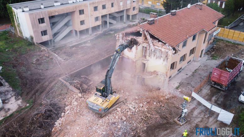 Ruspe in azione nel quartiere di San Domenico a Udine: sono iniziate infatti le demolizioni delle vecchie case popolari, che verranno sostituite con appartamenti di dimensioni più ridotte, ma più moderni e sostenibili dal punto di vista energetico.