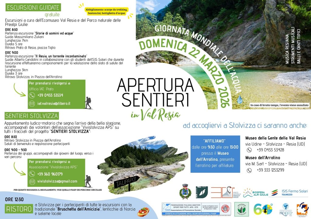 La Val Resia si prepara a celebrare la Giornata mondiale dell’acqua con una giornata interamente dedicata alla natura, alla scoperta del territorio e alla partecipazione della comunità locale. Domenica 22 marzo è infatti in programma l’evento “Apertura Sentieri in Val Resia”, iniziativa che segna simbolicamente l’avvio della stagione escursionistica nella valle.