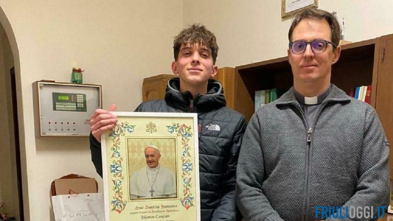 Il giovane, visibilmente emozionato, ha ricevuto la benedizione papale per il suo servizio liturgico, considerato un piccolo segno di fede. Thomas suona dall’età di cinque anni, e quest’anno si prepara a concludere la maturità presso l’Isis Scarpa di Motta di Livenza, con indirizzo informatico. Frequenta anche il seminario diocesano a Pordenone.