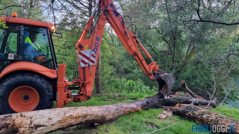 L’intervento della protezione civile per rimuovere alcuni tronchi nel fiume Livenza.