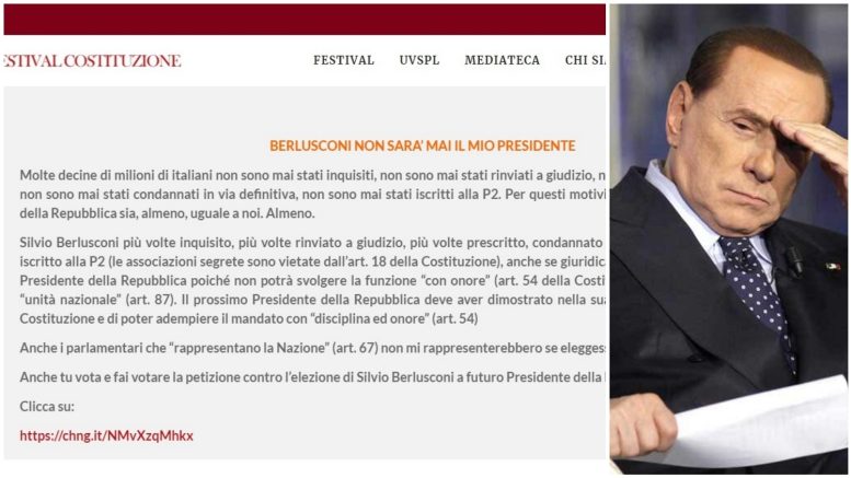 L’affondo del direttivo di Festival Costituzione è di quelli tutt’altro che leggeri. “Silvio Berlusconi – si legge sul sito – più volte inquisito, più volte rinviato a giudizio, più volte prescritto, condannato in via definitiva per frode fiscale, già iscritto alla P2 (le associazioni segrete sono vietate dall’art. 18 della Costituzione), anche se giuridicamente eleggibile, non sarà mai il mio Presidente della Repubblica poiché non potrà svolgere la funzione “con onore” (art. 54 della Costituzione) e non potrà rappresentare l’ “unità nazionale” (art. 87). Il prossimo Presidente della Repubblica deve aver dimostrato nella sua vita di aver rispettato le leggi e la Costituzione e di poter adempiere il mandato con “disciplina ed onore” (art. 54)”. E sul portale, così, appare anche il link a una petizione online contro l’elezione di Berlusconi a futuro presidente, legata alla piattaforma Change.