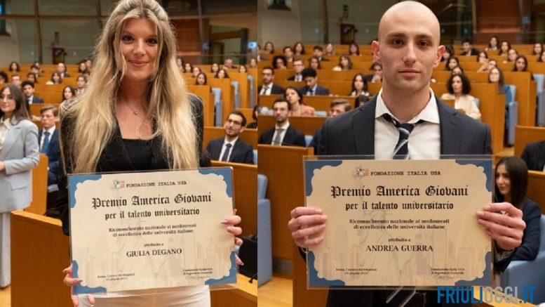 Giulia Degano e Andrea Guerra, neolaureati dell’Università di Udine, entrambi di San Daniele del Friuli, hanno vinto il Premio America Giovani al talento universitario della Fondazione Italia Usa. Degano e Guerra hanno conseguito il titolo con il massimo dei voti e la lode.