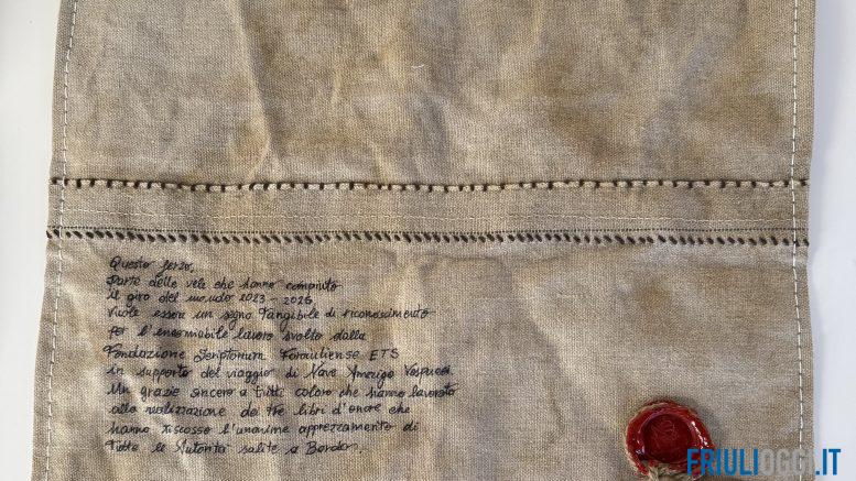 La delegazione della Fondazione sandanielese, infatti, è stata ricevuta nella Sala del Consiglio di Nave Vespucci, dove il Comandante gli ha consegnato un un pezzo di vela bordata con la dicitura: “Questo ferzo, parte delle vele che hanno compiuto il giro del mondo 2023-2025, vuole essere un segno tangibile di riconoscimento per l’encomiabile lavoro svolto dalla Fondazione Scriptorium Foroiuliense in supporto del viaggio di nave Amerigo Vespucci. Un grazie sincero a tutti coloro che hanno lavorato alla realizzazione dei tre libri d’onore che hanno riscosso l’unanime apprezzamento di tutte le autorità salite a bordo”.
