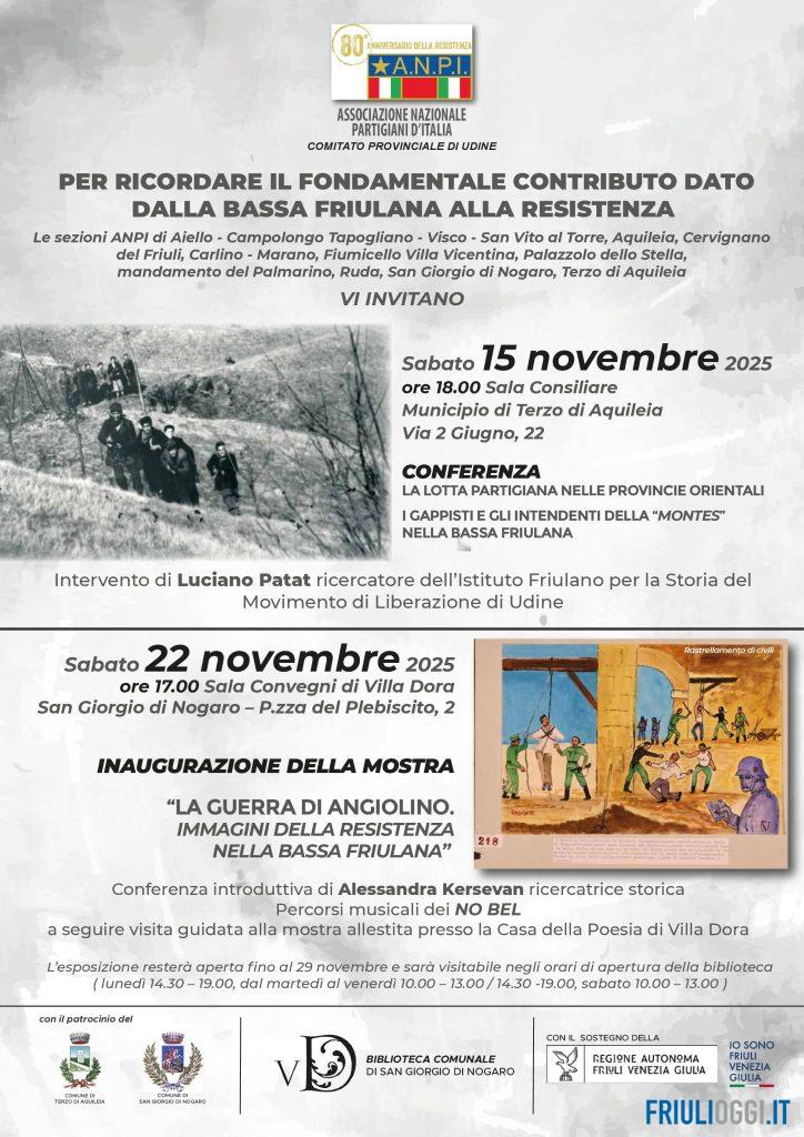 Sabato 22 novembre, alle 17, nella sala convegni di Villa Dora, a San Giorgio di Nogaro, sarà inaugurata la mostra “La guerra di Angiolino, immagini della Resistenza nella Bassa friulana”. Il vernissage sarà accompagnato da una conferenza introduttiva e da una visita guidata alla mostra a cura della ricercatrice storica Alessandra Kersevan. L’evento, proposto dall’Anpi nell’ottantesimo anniversario della Liberazione, sarà accompagnato dalle musiche dei No Bel.