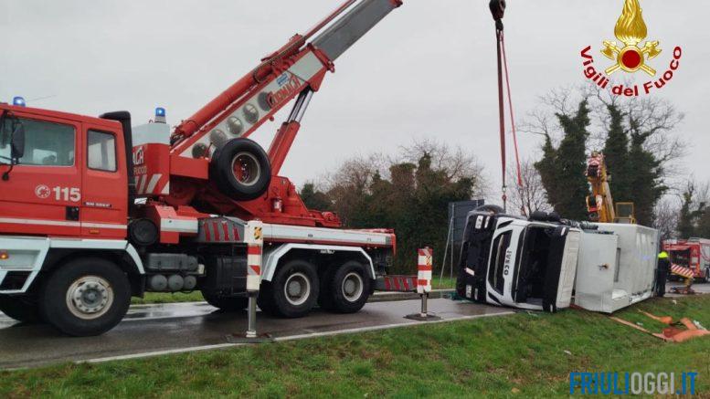 Terminate le operazioni di soccorso, è stato necessario un complesso intervento per raddrizzare il camion. La manovra è stata eseguita in coordinazione tra la gru dei vigili del fuoco e un’autogru messa a disposizione da una ditta privata. Sul posto sono intervenuti anche i Carabinieri e la Polizia Locale per gli accertamenti di competenza.