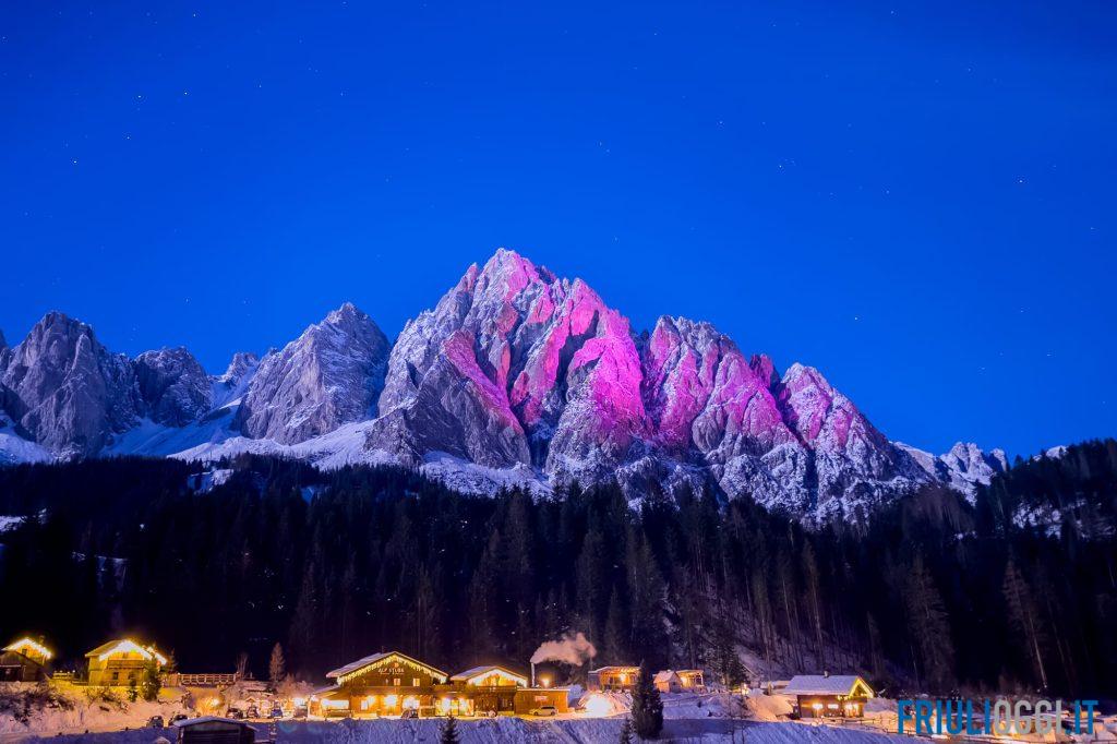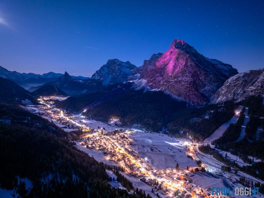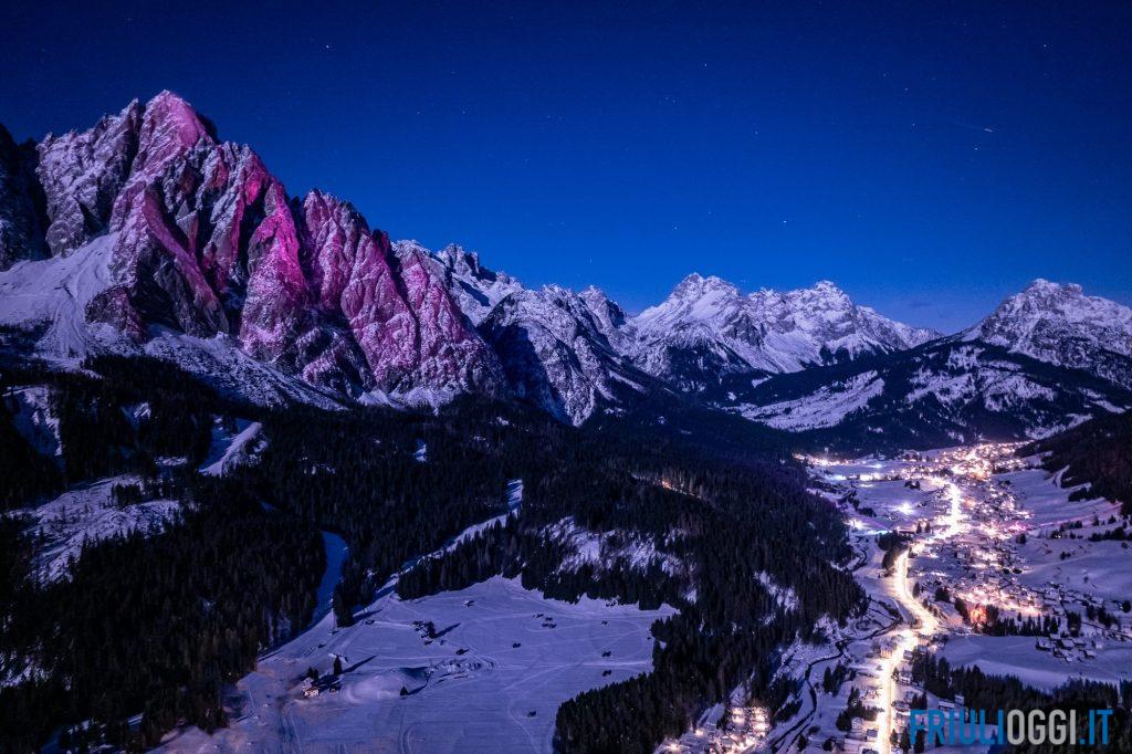 A 100 giorni dalla partenza del Giro d’Italia Sappada si è vestita di rosa. Il maestoso Monte Siera e uno scorcio dell’antica Borgata Kratten ieri sera erano colorate di rosa, in onore ad uno dei più importanti eventi ciclistici al mondo che toccherà il 24 maggio prossimo anche la località montana con l’arrivo della tappa Mortegliano-Sappada.