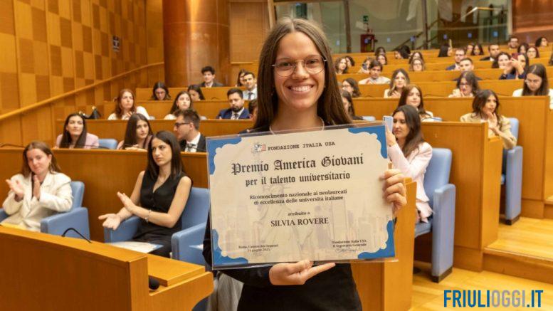 Premio “America Giovani al talento universitario” per Silvia Rovere, di Spilimbergo, laureata con il massimo dei voti (110 e lode) in Diritto per le imprese e le istituzioni al Dipartimento di Scienze giuridiche dell’Università di Udine. L’iniziativa, promossa dalla Fondazione Italia Usa, premia ogni anno mille neolaureati con percorsi di studi di eccellenza per sostenerli nell’ingresso nel mondo del lavoro internazionale.