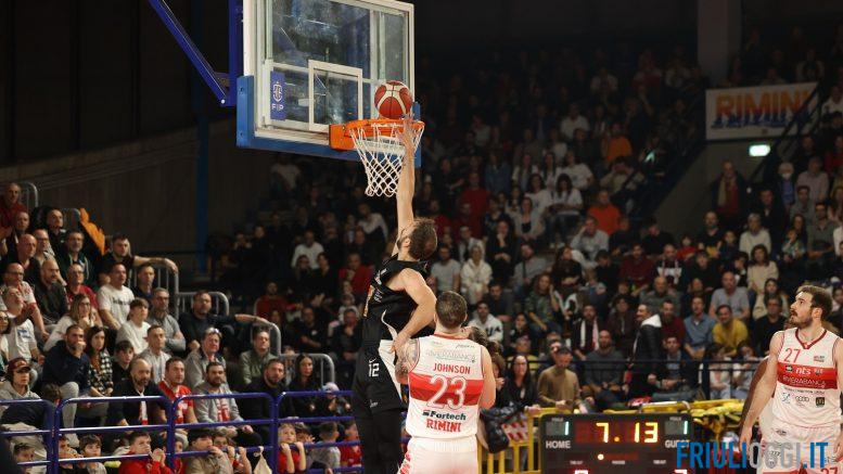 Udine senza Alibegovic, rimasto a casa per una sindrome influenzale, tiene botta nel primo quarto chiudendo sotto 24 a 22, subendo tanto dentro l’area da Justin Johnson a quota 12 dopo dieci minuti. Il secondo quarto è un incubo per i friulani che sbagliano quasi tutto segnando solo 10 punti e subendone 25. Il punteggio segna un eloquente 49 a 32 all’intervallo e sostanzialmente la partita è già finita nonostante il miglior Marcos Delia della stagione. Nella ripresa Udine non riesce a riavvicinarsi nonostante trovi un po’ più spesso il canestro, soprattutto con Clark e Caroti. L’Apu arriva a meno cinque quando mancano solo 54 secondi alla sirena finale, ma due liberi di Marks riportano a più sette Rimini e chiudono la partita. Top scorer Jason Clark con 18, 16 a testa per Marcos Delia e Lorenzo Caroti.