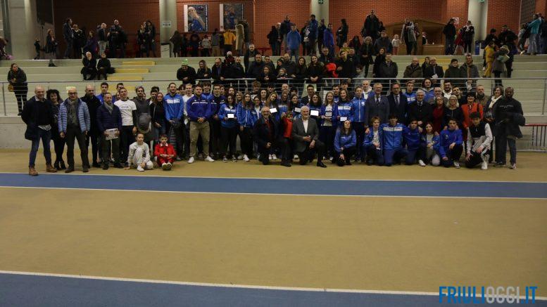 La premiazione dei campioni udinesi è tornata in presenza e ha visto la partecipazione, oltre che della dirigenza societaria e degli atleti con le famiglie, anche di autorità e rappresentanti istituzionali. Dal presidente del consiglio regionale Piero Mauro Zanin al consigliere regionale Mauro Di Bert, fino al sindaco di Udine Pietro Fontanini e all’assessore allo sport Antonio Falcone. Presente anche l’ingegner Gianpietro Benedetti in rappresentanza della Danieli e il delegato Fidal Fvg Massimo Di Giorgio.