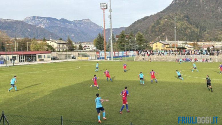 Al 17′ proteste tolmezzine poi per un fallo di mano nell’area ospite, non ravvisato dal direttore di gara, quindi al 21′ si mette in mostra Coradazzi che si trova a tu per tu con il portiere avversario, il tiro che sembrava diretto in gol viene miracolosamente deviato in corner da Spollero; poco dopo è il turno di Micelli, ribattuto dalla difesa e al 42′ ancora Fabris a cercare la porta, con uno Spollero ulteriormente determinante.