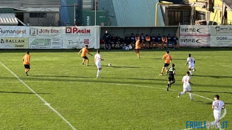 Parte meglio il Cjarlins Muzane e dopo 7’ potrebbe essere già vantaggio quando Fyda guida la ripartenza e serve Chiccaro, con il centrocampista che temporeggia, rientra sul sinistro e calcia trovando la respinta di Minozzi. Ci prova Scozzarella, direttamente da calcio di punizione alto, prima che il Cjarlins Muzane al 27’ confezioni la seconda occasione per il vantaggio: sul cross di Chiccaro dal fondo il colpo di testa di Calì, da buona posizione, è alto. Prova ad affacciarsi dalle parti di Bonucci il Campodarsego al 34’ con il destro dal limite di Cocola che non inquadra la porta, preludio al vantaggio padovano firmato dall’ex Gerevini: il suo calcio di punizione, da posizione defilata, non è toccato da nessuno con la sfera che si infila sotto la traversa. Accusa il colpo il Cjarlins Muzane e prima dell’intervallo è raddoppio Campodarsego, quando la sponda di Cocola è preda dell’accorrente Ballan il cui destro, radente, si infila in rete. Sembra chiudersi senza ulteriori emozioni la prima frazione, ma nel recupero Ballan colpisce a gioco fermo Fasolo sotto gli occhi del direttore di gara che estrae il cartellino rosso all’indirizzo dell’esterno di casa e costringe il Campodarsego all’inferiorità numerica.
